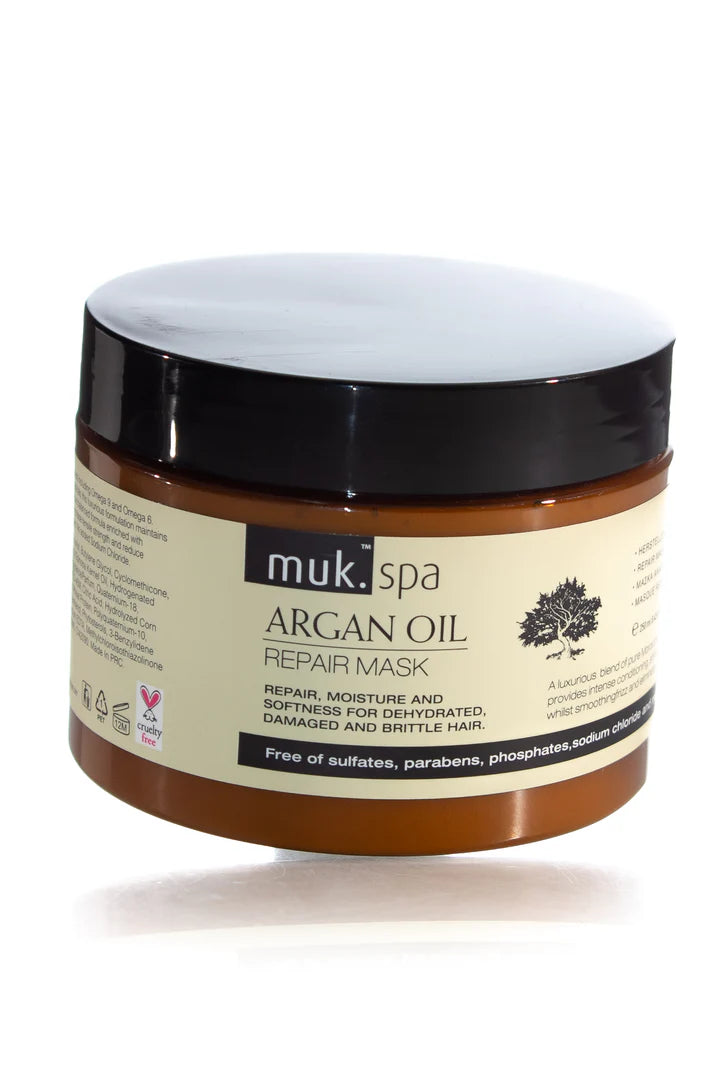 **Directions: **Shampoo hair with Muk Spa Argan Oil Repair Shampoo. Towel dry hair and apply mask from roots to ends. Leave on for between 10 and 25 minutes, depending on degree of conditioning required. May be used with heat for more intense conditioning results. For optimal results use Muk Spa Argan Oil Treatment or Shine Spray on a regular basis.