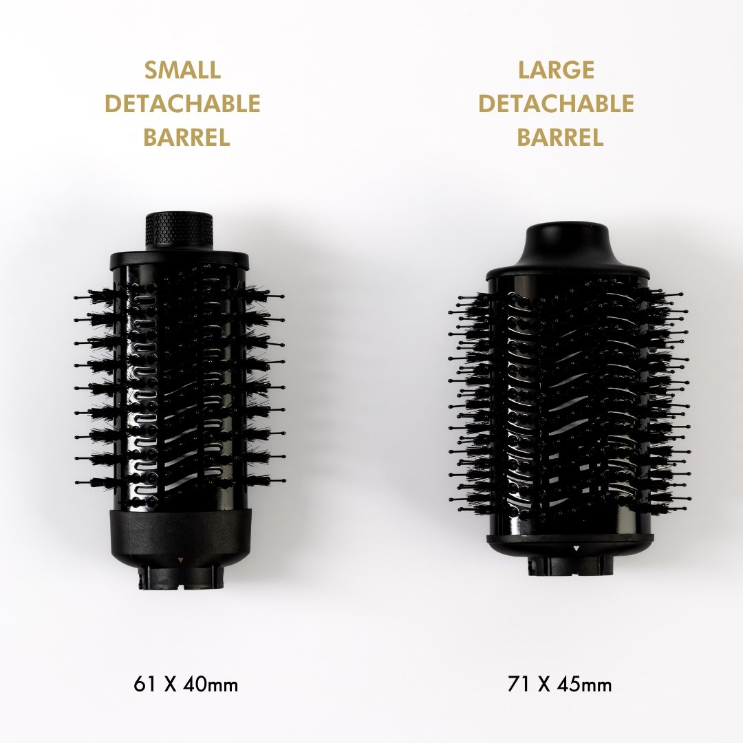 The ONLY two head detachable Blowout Brush on the market, the Dual Set comes with 2 sized barrels: The Small and Large - perfect for ALL hair lengths.