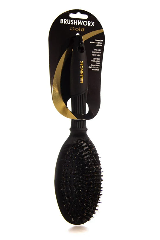 Introducing the Brushworx Gold Oval Cushion Boar Bristle Hair Brush—where gold meets brilliance. The latest addition to the Brushworx Gold series, this cushion brush is designed for rapid drying and impeccable smoothing. Elevate your styling routine with the luxurious performance of the Gold Series.