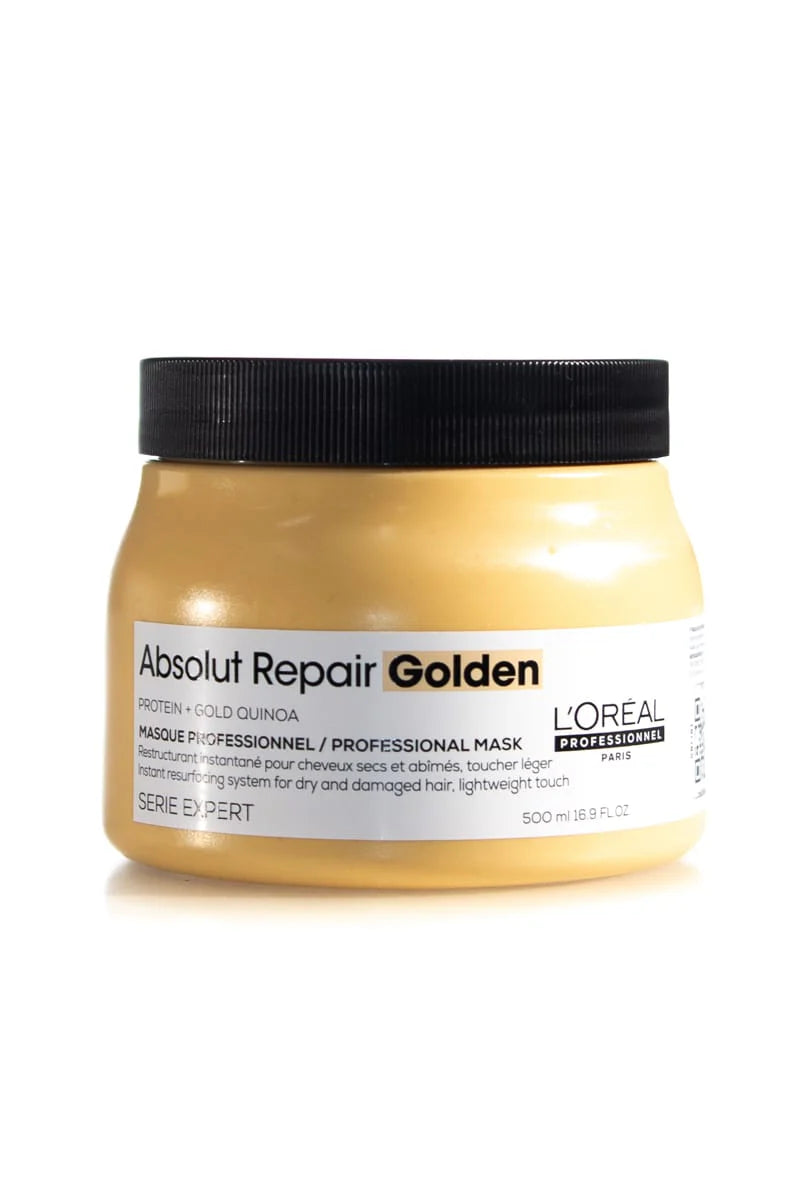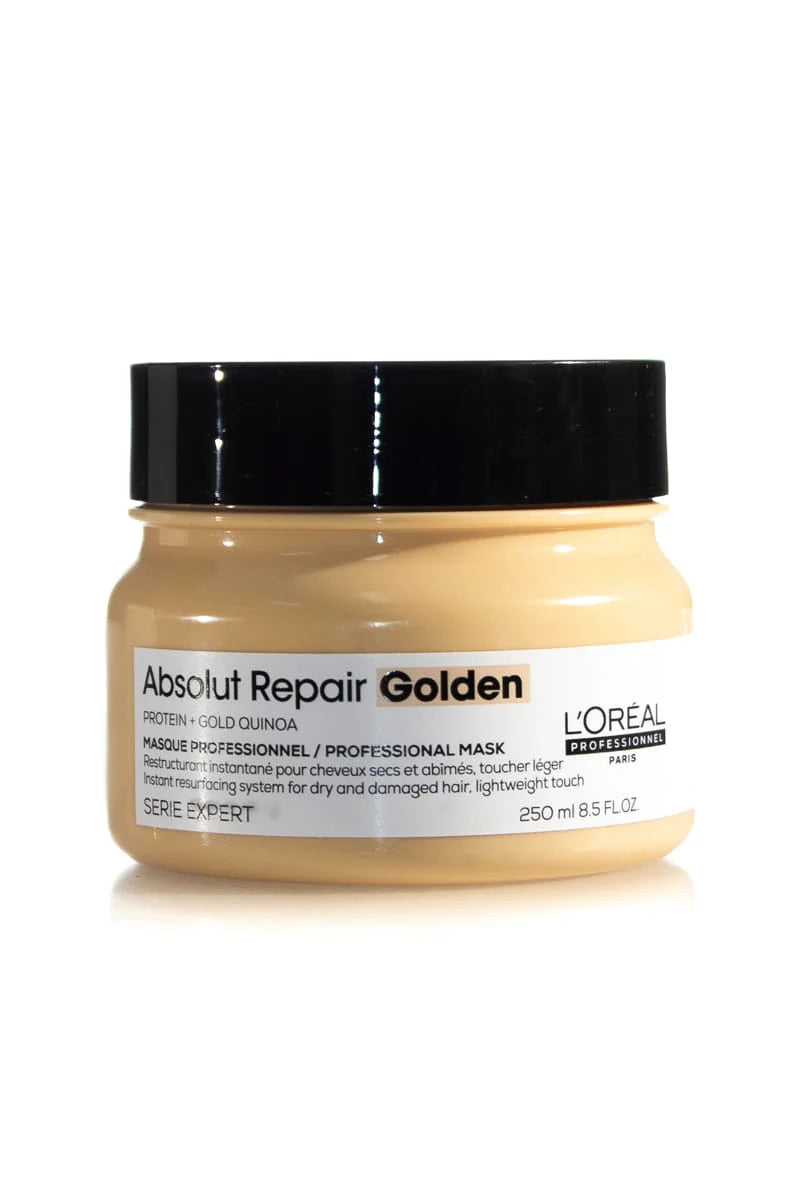 L'Oréal Professionnel Serie Expert Absolut Repair Golden Masque 250ml is a lightweight masque for those with damaged hair. Its formula is infused with Gold Quinoa Bran extract and Wheat Protein for instant resurfacing of the hair fibre, leaving hair instantly restored, soft and shiny.