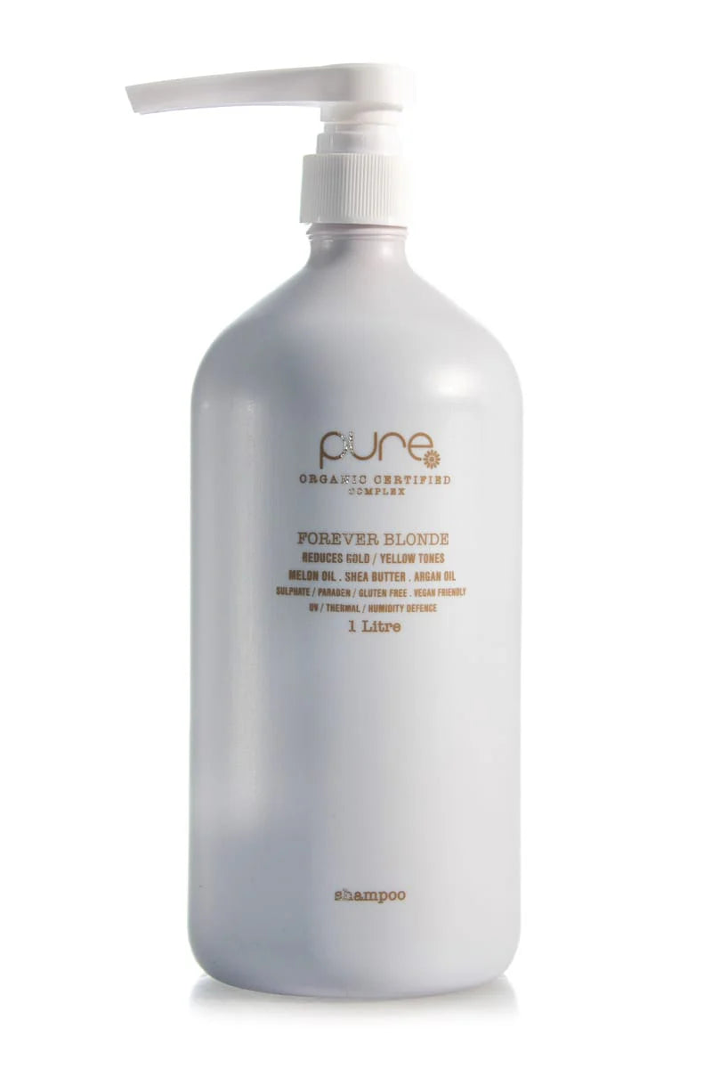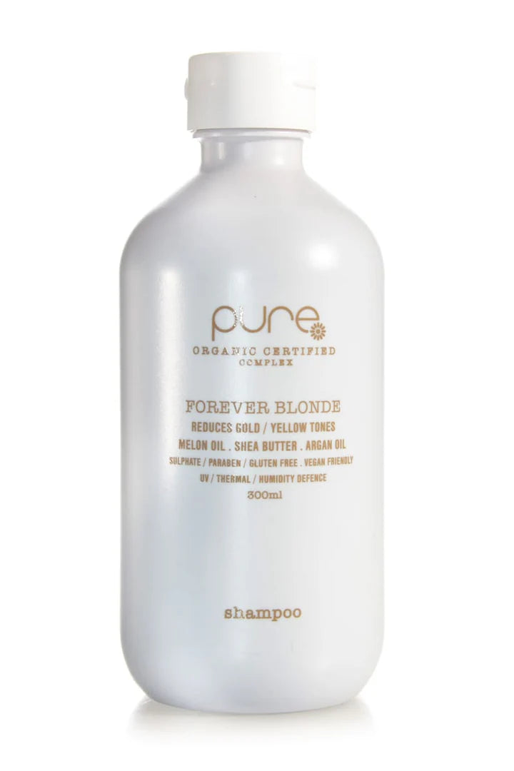 PURE FOREVER BLONDE luxury shampoo with exclusive ‘pure complex’TM (certified 100% organic extracts) gently cleanses while reducing yellow and gold tones in all blonde hair.