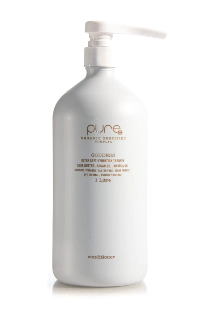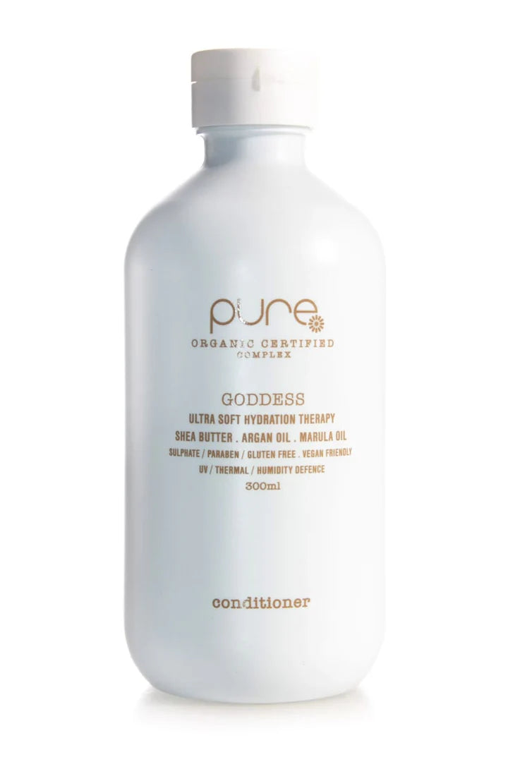 PURE GODDESS CONDITIONER with exclusive ‘pure complex’TM (certified 100% organic extracts) hydrates, restores moisture and manageability to dry, frizzy, unruly hair.