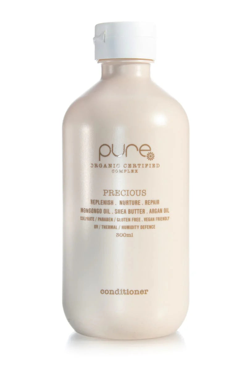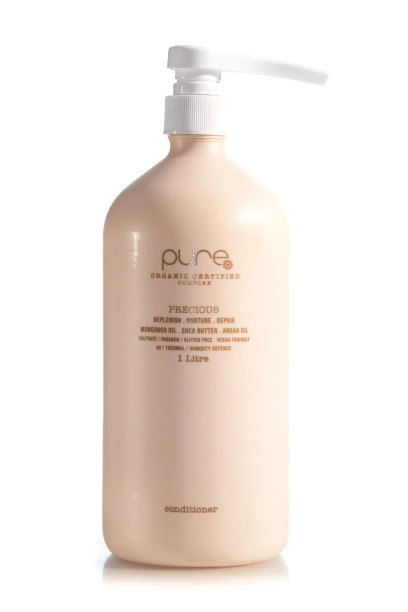 PURE PRECIOUS CONDITIONER with exclusive ‘pure complex’TM (certified 100% organic extracts) repairs, strengthens and shines all fragile, dry or weak hair types.