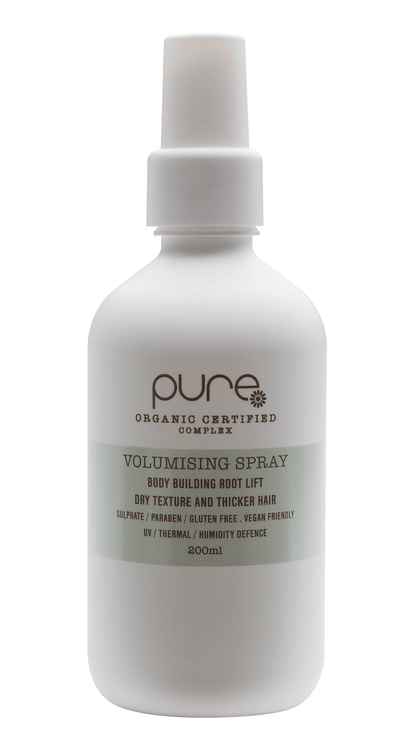 PURE VOLUMISING SPRAY is an anti-gravity spray adding root-lift height and definition. Boost thickness with medium control and body. With exclusive ‘pure complex’TM (certified 100% organic extracts)