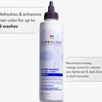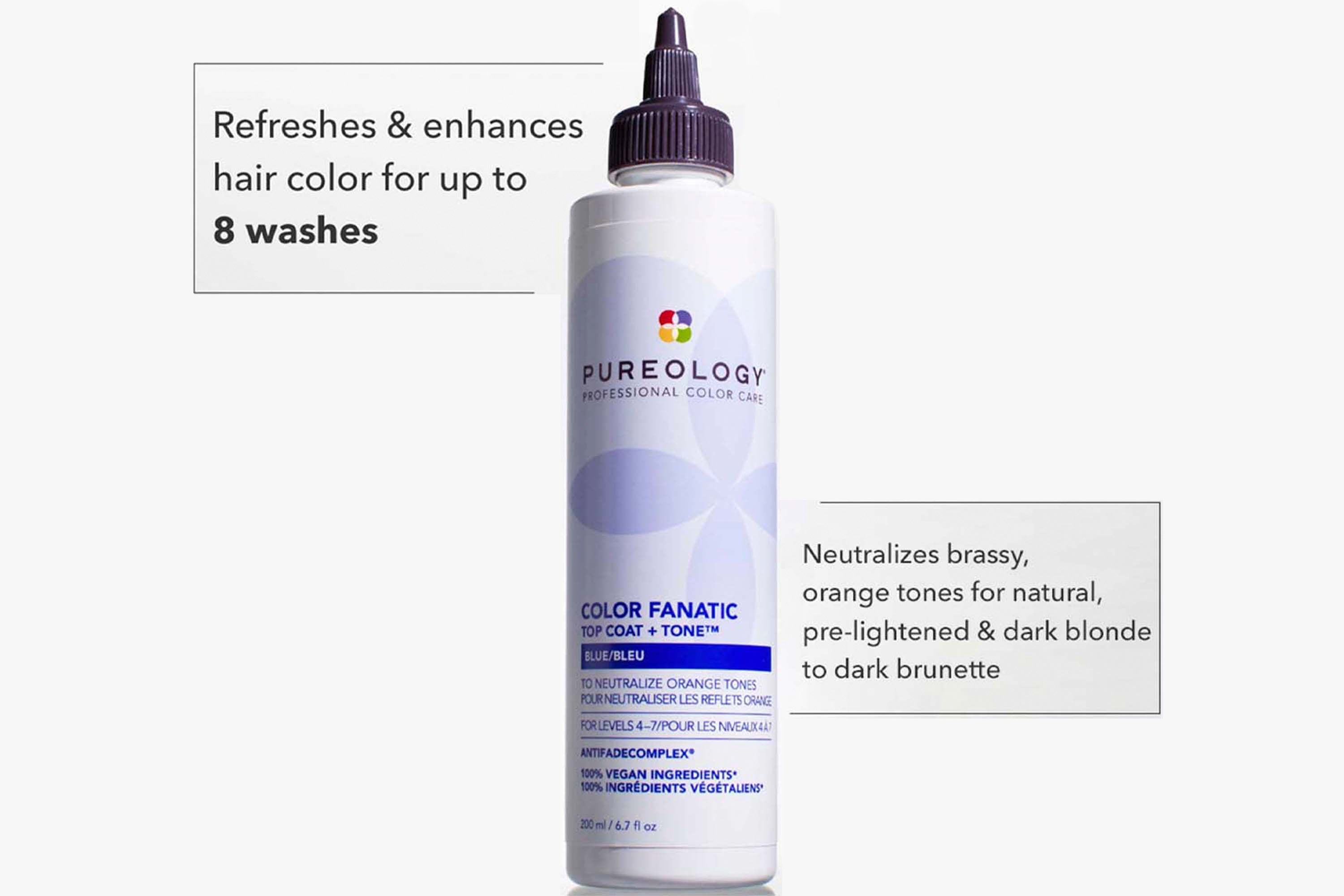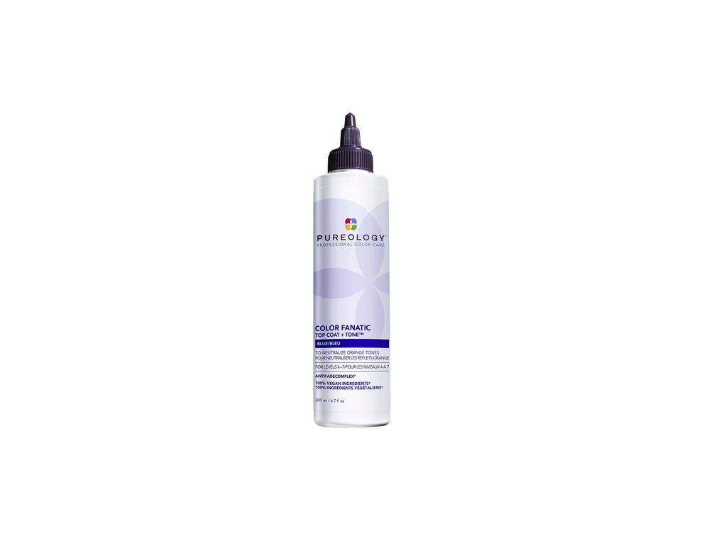 Step One: After preferred Pureology shampoo, remove excess water from the hair. Step Two: Apply Color Fanatic Top Coat + Tone Blue evenly throughout hair. When using Top Coat + Tone Blue apply to previously color-treated areas to neutralize unwanted tones. Step Three: Leave in for 5-10 minutes and rinse thoroughly. Step Four: Finish with preferred Pureology conditioner or mask, only if necessary.
