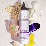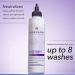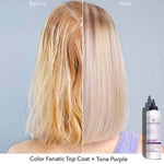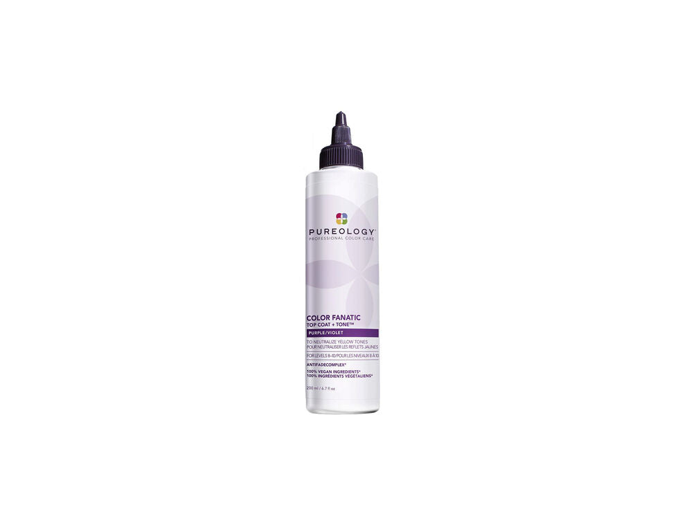 Step One: After preferred Pureology shampoo, remove excess water from the hair. Step Two: Apply Color Fanatic Top Coat + Tone Purple evenly throughout hair. When using Top Coat + Tone Purple apply to previously color-treated areas to neutralize unwanted tones. Step Three: Leave in for 5-10 minutes and rinse thoroughly. Step Four: Finish with preferred Pureology conditioner or mask, only if necessary.